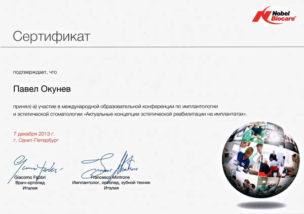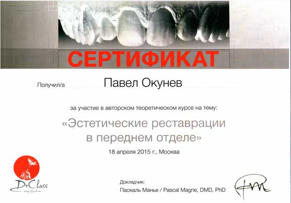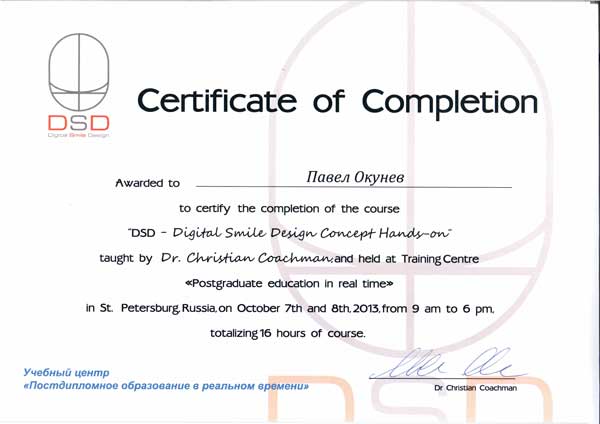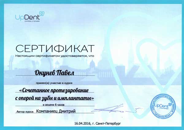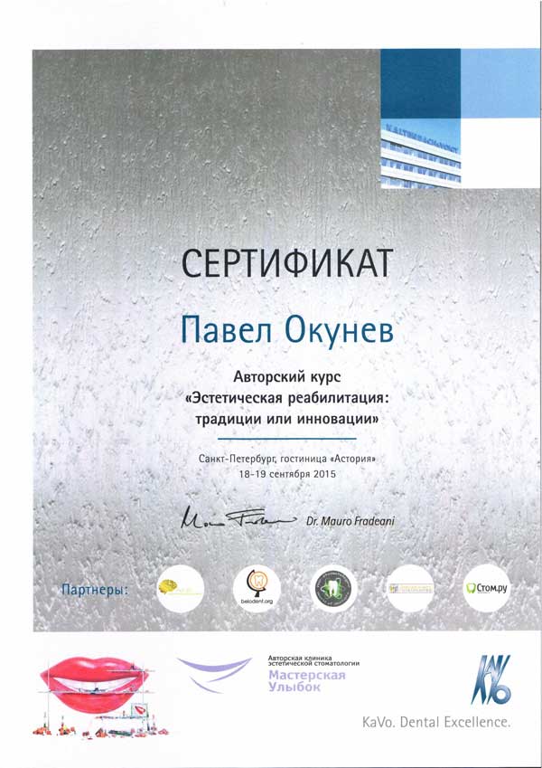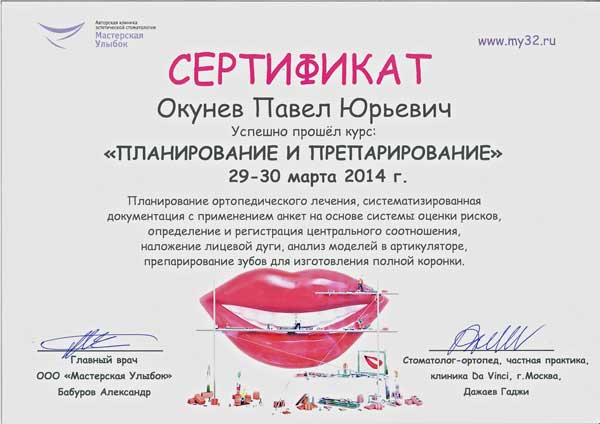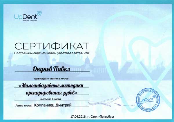 Окончил Санкт-Петербургский Государственный Медицинский Университет имени академика И.П. Павлова в 1999 году. Проходил интернатуру на кафедре ортопедической стоматологии СПБГМУ им. Павлова. Являюсь сертифицированным специалистом по ортопедической, терапевтической и хирургической стоматологии. Врач высшей категории. Много учусь, посещаю практические и теоретические семинары, съезды, курсы и конференции. Обучался у ведущих специалистов России, Европы и Америки. Обладаю всеми необходимыми современными знаниями и навыками для оказания квалифицированной стоматологической помощи на высшем мировом уровне. Сотрудничаю с ведущими специалистами смежных специальностей и зуботехническими лабораториями. Много лет работаю в цифровом протоколе лечения и не представляю свою работу без современных цифровых технологий. В своей работе считаю главным понять пациента, установить честные, доверительные отношения, поставить правильный диагноз, предложить то решение проблемы, которое приведет к выздоровлению самым оптимальным методом, не навредить и создать шедевр.