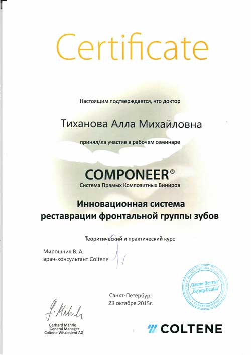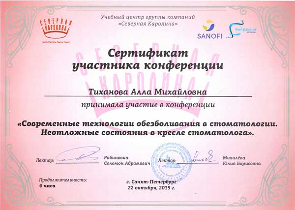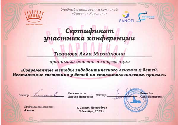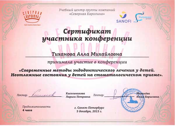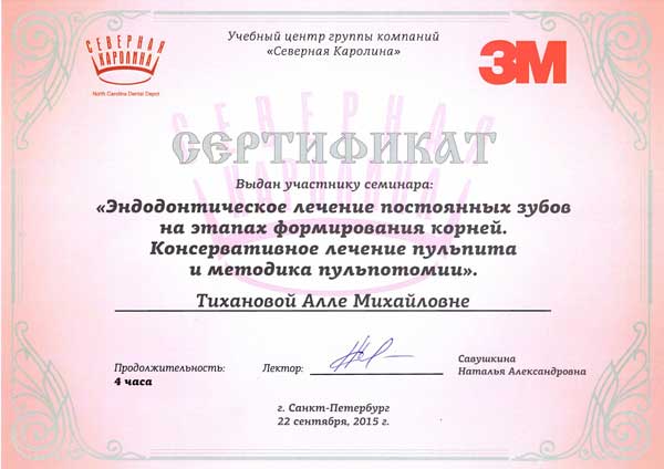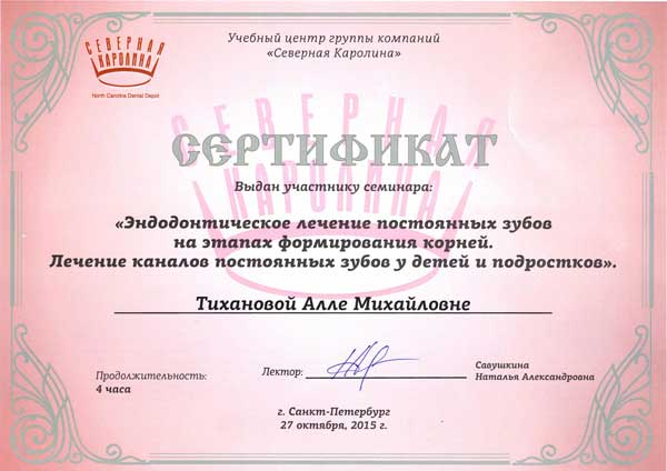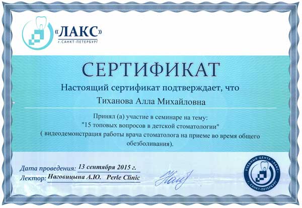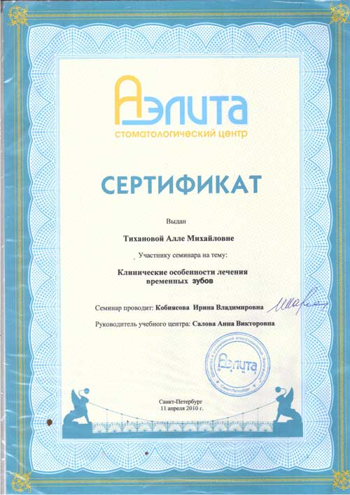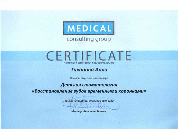 Закончила 1-й ЛМИ им. Павлова в 1987 году. Врач 1-ой категории, стоматолог-терапевт, детский стоматолог. Неоднократно проходила курсы усовершенствования при МАПО, в учебном центре «Амфодент». Принимала участие в конференциях зарубежных фирм-производителей пломбировочных материалов и стоматологического оборудования. Работала в ведущих частных клиниках города.